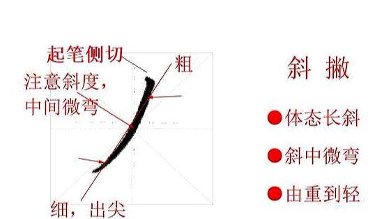 无论是哪一种笔画,笔画书写都分为三部分,起笔、行笔和收笔。撇画的起笔要根据撇画的方向作不同角度的侧切入笔稍重,然后转笔由重到轻,最后行至末端稍用力撇出。