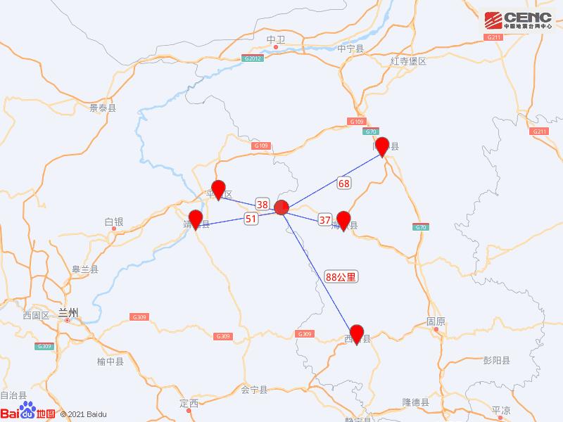 震中距海原县37公里、距甘肃白银平川区38公里、距甘肃靖远县51公里、距同心县68公里、距西吉县88公里,距中卫市95公里,距银川市222公里,距兰州市143公里。