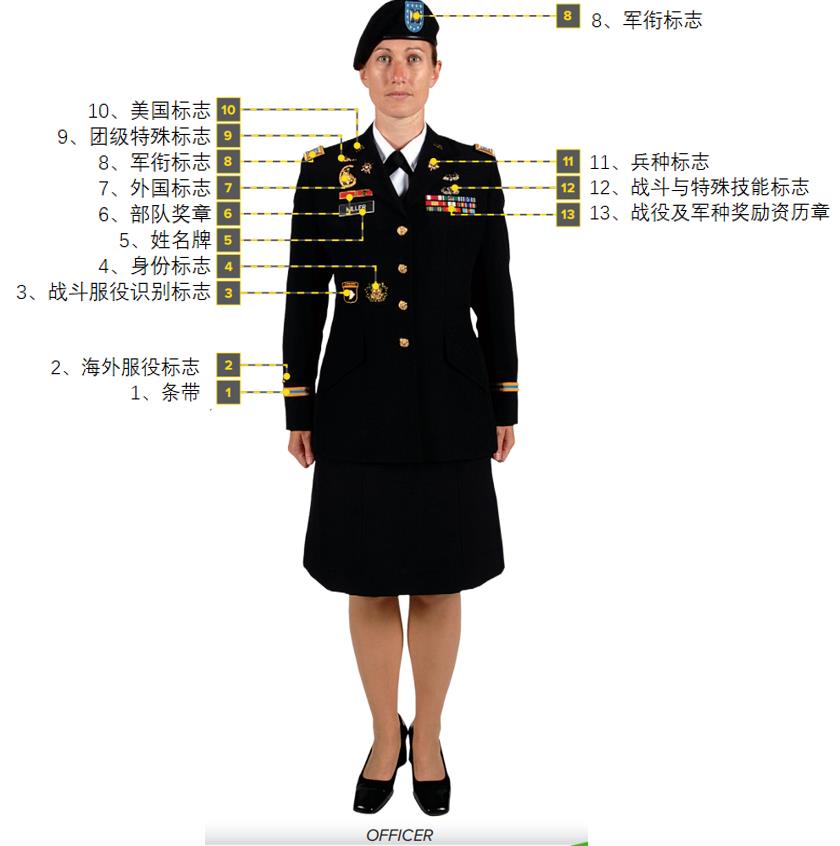 参见上图。美军:陆军军官常服(ARMY OFFICER SERVICE UNIFORM,ASU)及标志