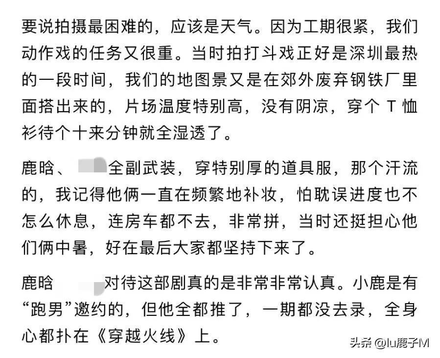 鹿哥愿意来尝试这个有挑战的角色,所以接下了这个有挑战的剧本,而且拍摄穿越火线期间,当时的气温非常高,鹿哥怕耽误进度都不怎么休息,有pn邀约都推了,