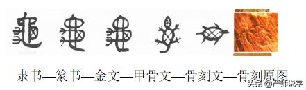 龟(贵guī 丘qiū 皲jūn)的甲骨文字形,头象它(蛇)头,左象足,右象甲壳,下面象尾。隶变楷化后,笔画释义有了新的变化,不只从外表特征来表示,还能反应其生活特性。繁体“龜”是由它的古字“”、两个“彐”、“乂”和“匚”组成的字。“”表示蛇,因龟头似蛇头;两个“彐”表示手握持东西的形状,因龟爪像手握紧的拳头;“乂”表示龟背的花纹,可用于龟卜(占卜);“匚”表示圆弧形的龟甲。简化后龟是由“⺈”、“田”和“乚”组成的字。“⺈”表示向内缩回的圆形的龟头;“田”表示水田,指示龟可生活在水中;“乚”表示卧、伏、爬等,这里指示龟可爬行。龟借“贵”声表示龟甲可做贵重的占卜用品或货币;龟借“丘”声表示龟背像凸起的山丘;龟借“皲”表示龟背的花纹像皮肤冻裂,即皲裂。
