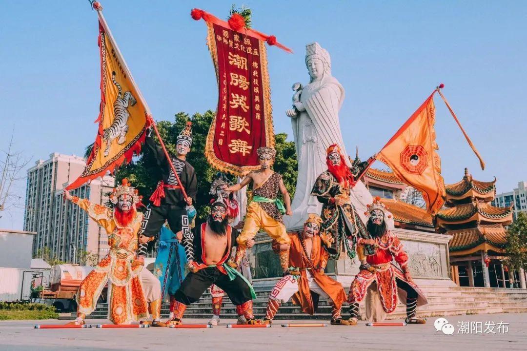 汕头潮阳英歌舞是汉族民间广场情绪舞蹈,于2006年被列入国家级非物质文化遗产名录。英歌舞的槌法变化多端,阵法乱而有序,唯一不变的是那象征着英雄好汉、具有艺术张力的英歌脸谱。