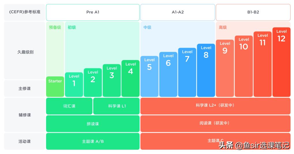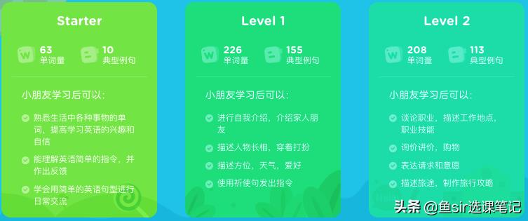 具体的课程内容和课程目标,鱼 sir将每个级别的单词量和句子数目做个简单罗列: