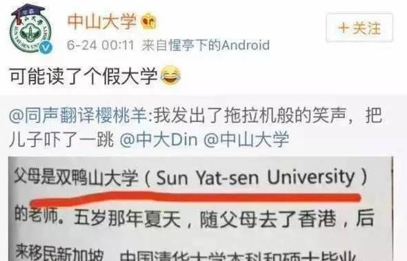 “双鸭山大学”的梗相信很多人也知道,它指的就是华南第一学府中山大学。大家都知道,中山大学是以孙中山先生的名字命名,英文校名为“Sun Yat-sen University”,谐音非常像“双鸭山”,而它在网络上流行,是因为有人在书中如此翻译。
