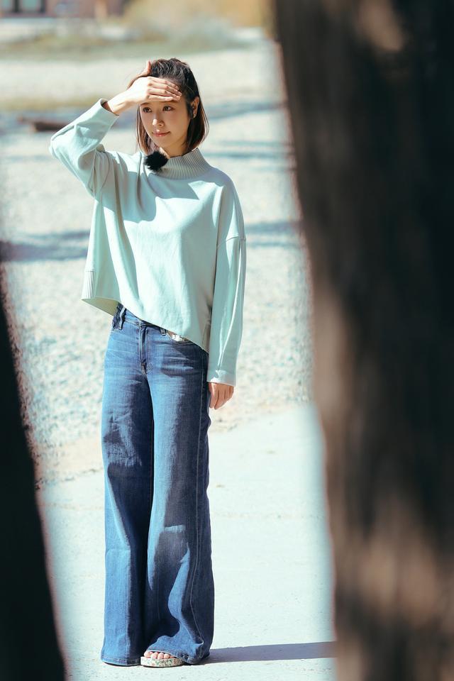 43岁林心如穿夸张喇叭裤,混搭拖鞋露出脚趾头,美得像小姑娘