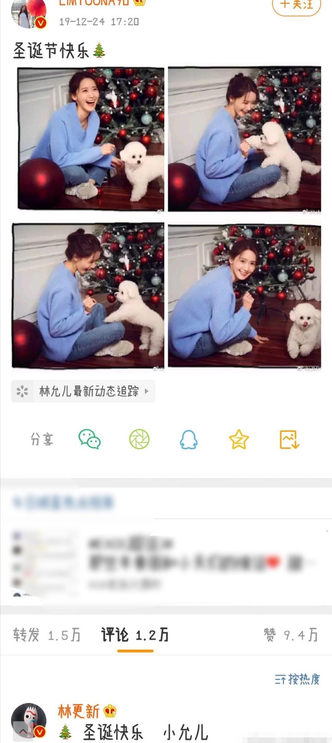 圣诞节来临之际,林允儿照常发微博祝各位粉丝圣诞节快乐,配图也是非常温馨的与狗狗握手的图片,加上幸福的笑容真是看了就让人感到舒服。