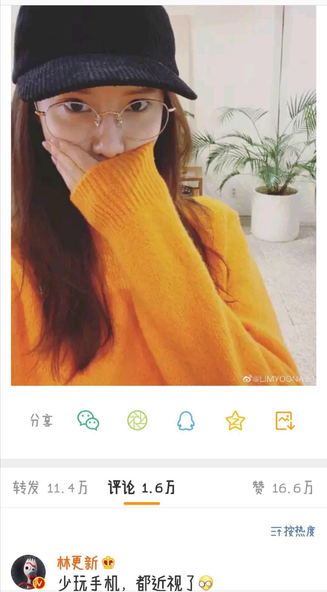 林允儿戴上眼镜来一波可爱风的自拍时,林更新是这样回复的:“少玩手机,都近视了。”话说林更新对林允儿关心那是肯定的了,只不过他的表述就不能稍微委婉一点吗?