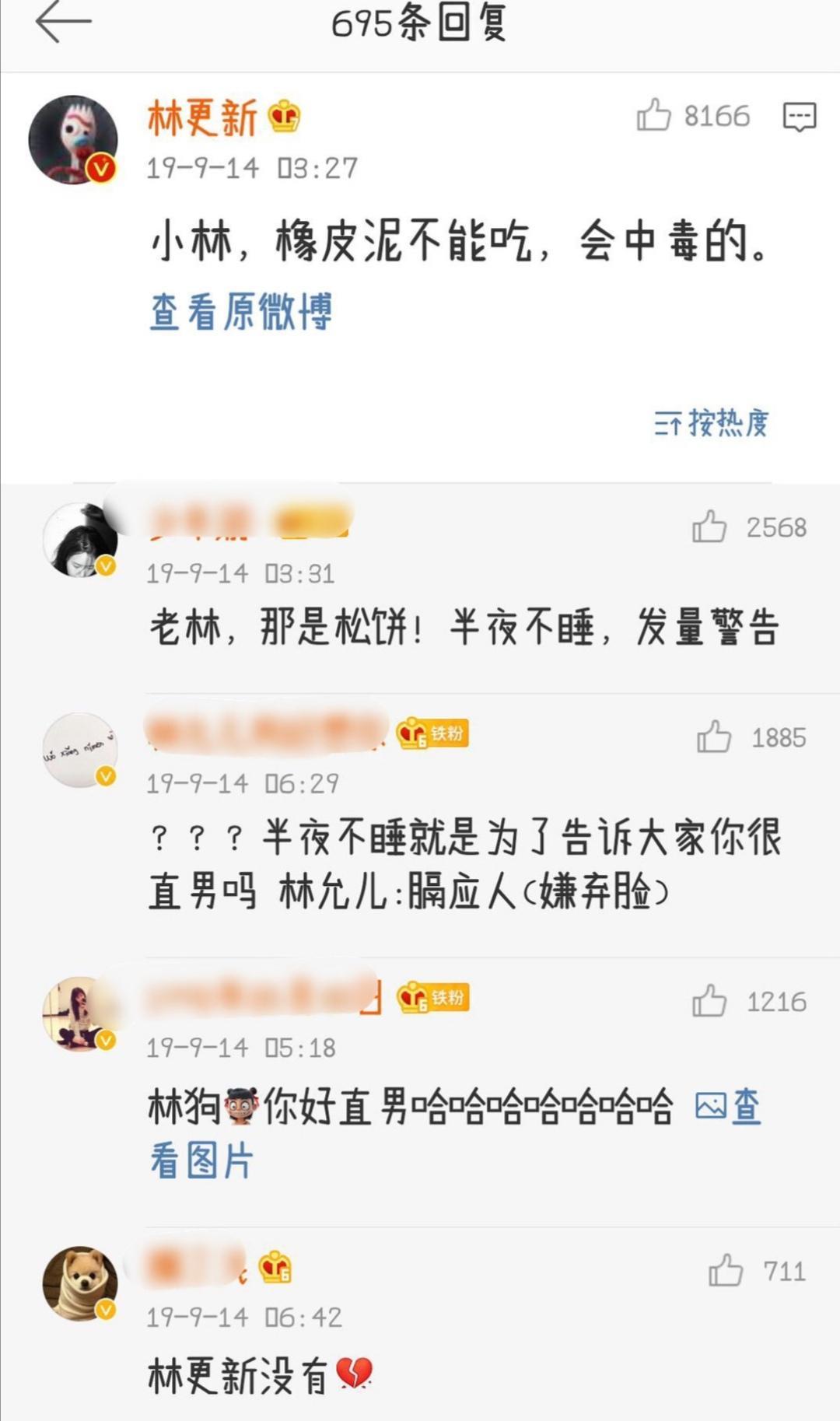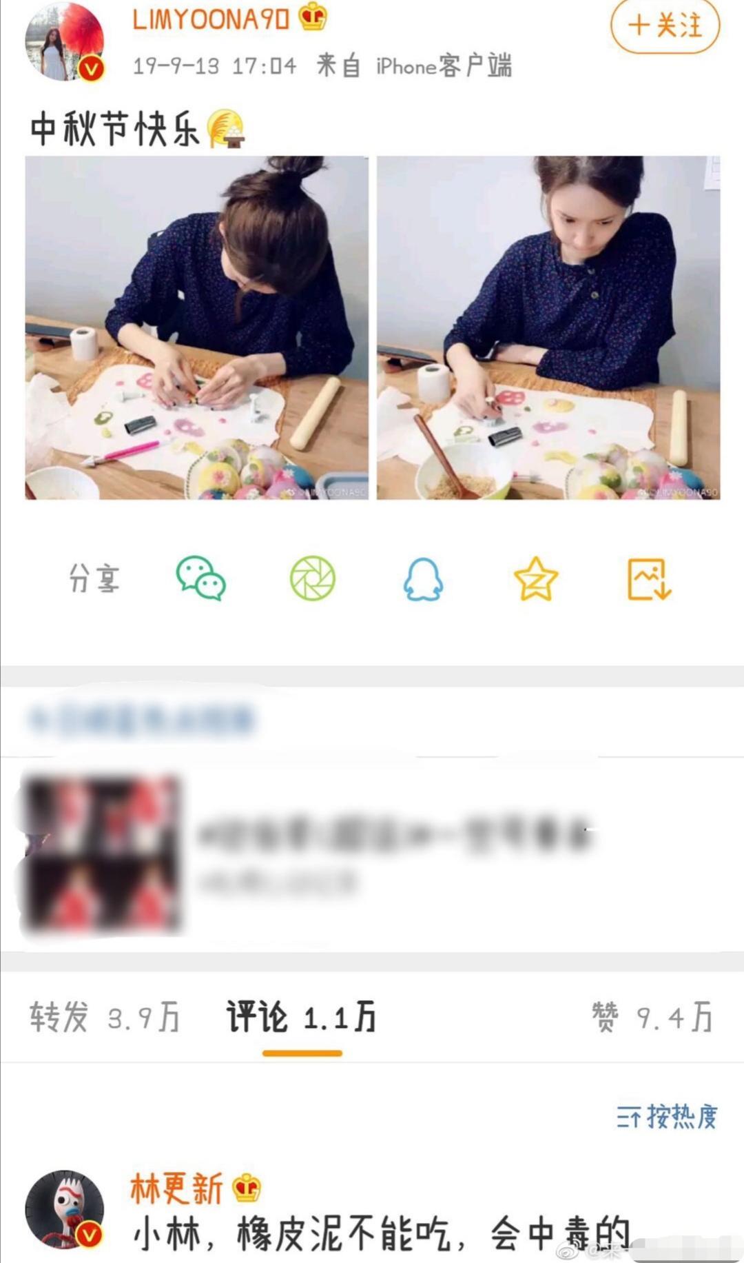 中秋节之际,林允儿在给粉丝送上祝福的同时还配上了自己做松饼的图片,整体来看女神有时候也是非常平易近人的嘛!只不过作为钢铁直男的林更新,却在评论区再一次高调地展示了专属于他的直白:“小林,橡皮泥不能吃,会中毒的。”