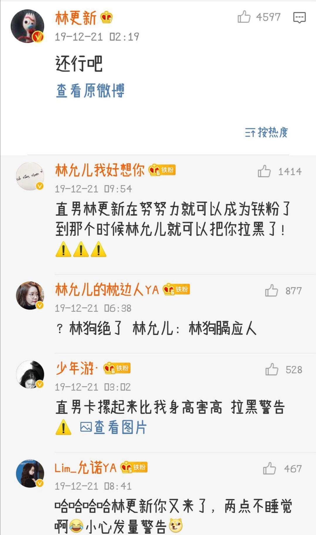 林更新回复林允儿微博,钢铁直男式回复吓坏网友:拉黑警告