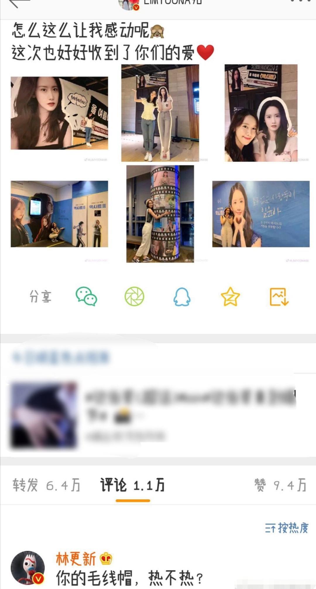 当收到礼物时作为爱豆的林允儿那也是非常开心滴,这不在微博上大晒特晒,而且配文也很有爱:“怎么这么让我感动呢,这次也好好收到了你们的爱!”满屏都是爱呀有木有!只不过作为铁粉的林更新,他的评论有可能会迟到但是却不会缺席:“你的毛线帽,热不热。”看到这儿先让子竹君笑一会儿,话说真是不得不佩服他的脑洞呀!
