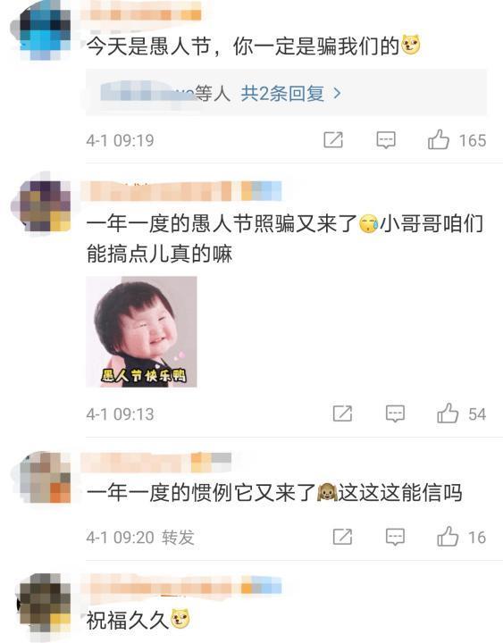 很多网友看到汪东城的发文后评论道“今天是愚人节,你一定是骗我们的,一年一度的愚人照骗又来了,小哥哥你能来点真的吗”,疑似都不相信这是真的,不过还有网友表示“公开恋情了,好不容易啊,祝福祝福”。
