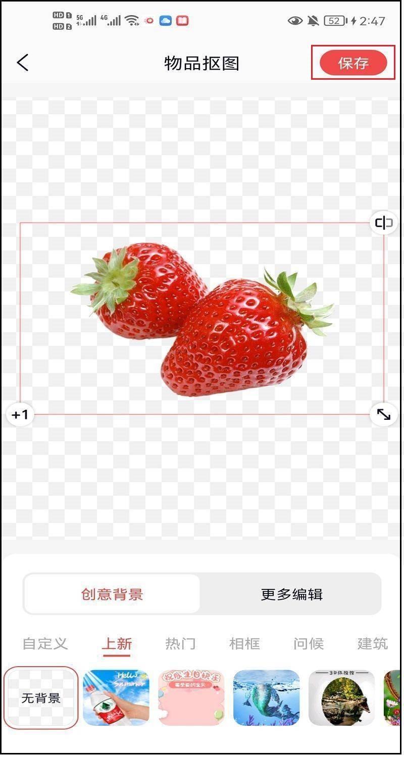 第三步:等待抠图成功后,可以看到物品已经被智能抠图出来了。此时可以更改背景进行编辑,也可以直接点击右上角的【保存】按钮保存照片。