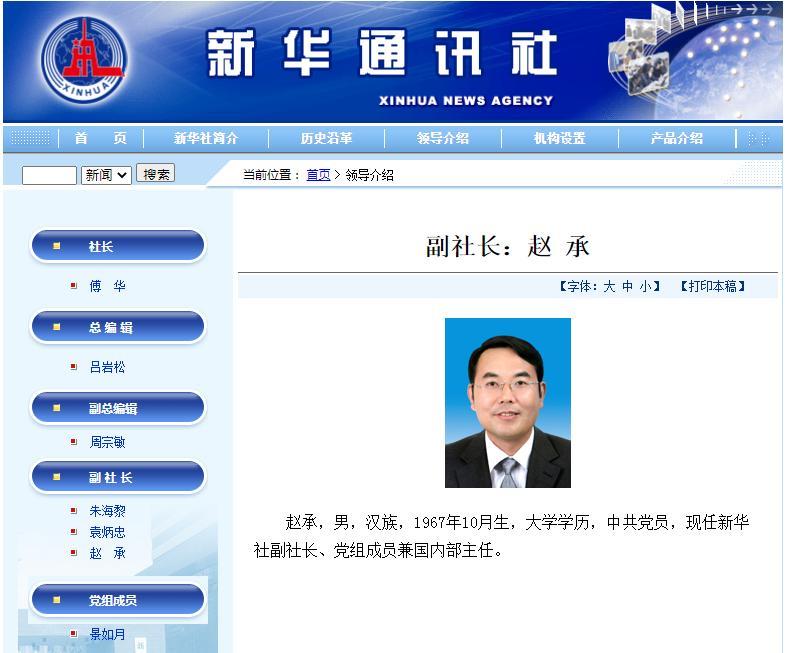 新华社官网显示,赵承,男,汉族,1967年10月生,大学学历,中共党员,现任新华社副社长、党组成员兼国内部主任。