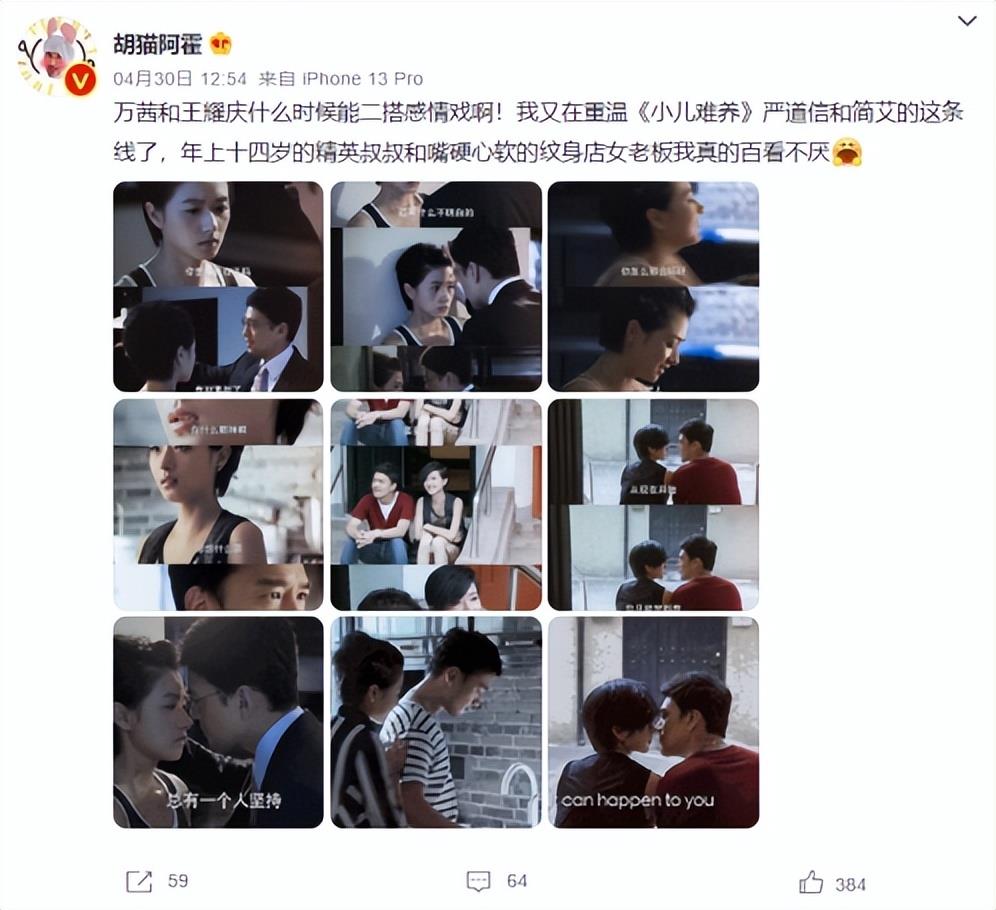 此外孙红雷、王耀庆、尹昉等优秀男演员也与万茜有过多次合作。比如王耀庆就和万茜合作过《脱身》《小儿难养》《婚战》等多部经典影视剧。在《小儿难养》中,万茜饰演特立独行的纹身师简艾,与王耀庆出演的“职场金领”严道信碰撞出意想不到的爱情火花,两人生动的演技让粉丝直呼“百看不厌”。