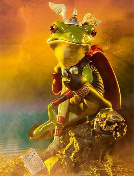 最后这位雷神的长相同样不像人,正如上图所示,他竟然是一只青蛙。雷神之蛙原名西蒙·沃尔特森,原本是一位运动员,后来膝盖因膝盖受伤而退出,但不巧的是,他的妻子也在不久之后去世了。沮丧的西蒙在一位女巫那里得到了与妻子灵魂交流的机会,但因为没有足够的支付费用而被变成的一只青蛙。随后西蒙与被洛基变成青蛙的索尔相遇,两人成了好伙伴。在一次意外中,索尔的雷神之锤破碎,西蒙拼尽全力,拿起了一根锤子碎片,并获得了雷神之力,随后他将碎片变成了一把完整的武器,并为自己改名特罗格,至此,雷霆之蛙诞生。