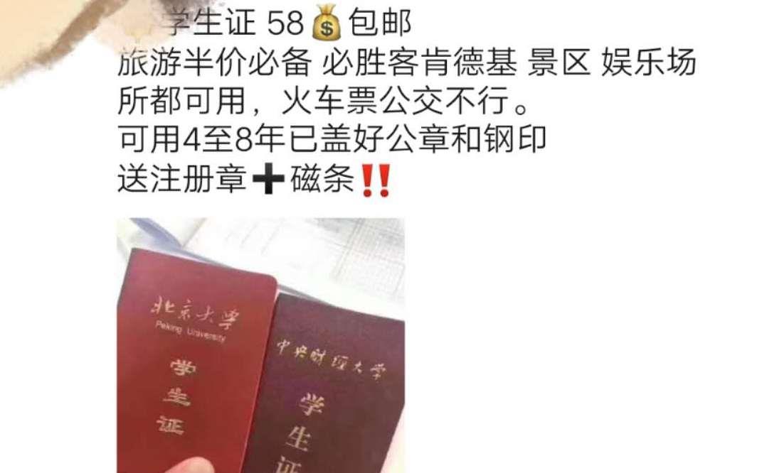 “学生证58元,包邮,旅游半价必备!”因为不少景区、餐馆推出学生证打折政策,让学生证在不少人心里“很值钱”。与此同时,也有人看中了这块“打折福利”的吸引力,不惜铤而走险公然“卖”起了学生证。