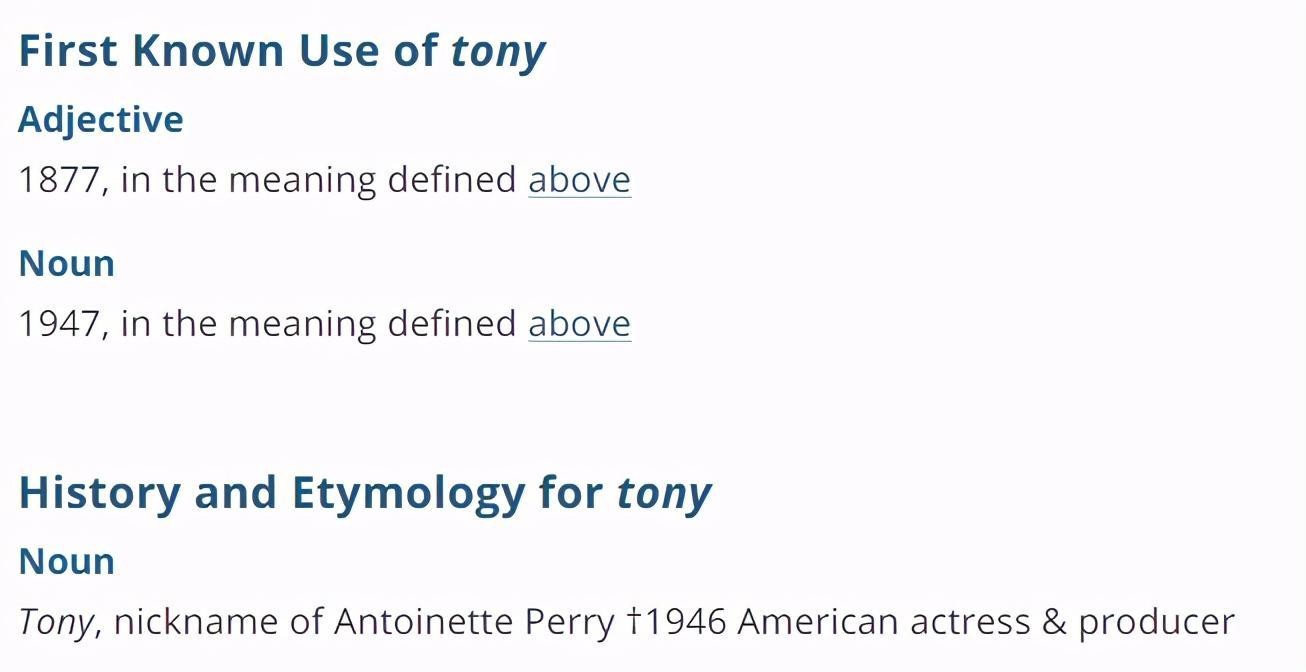 tony做名词时,除了人名外,还有一个意思:托尼奖(美国的舞台剧成就奖)