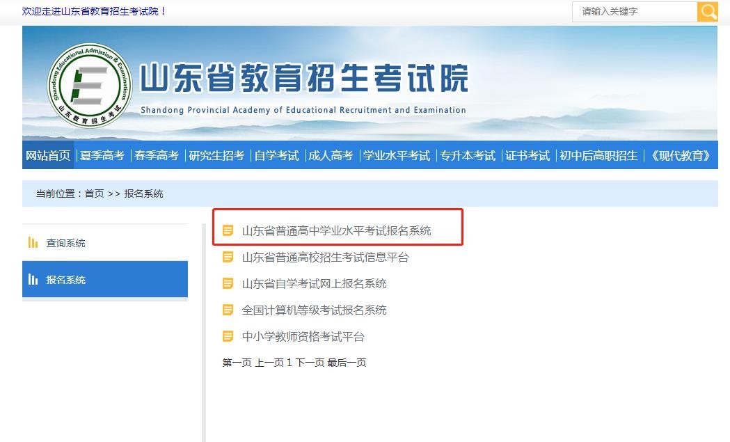 登录山东省教育招生考试院官网,点击“网上报名”,再点“山东省普通高中学业水平考试网上报名系统” ,登陆报名系统!