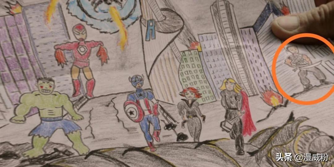 重点来了:在《复联1》时间线的镜头中,艾德里安拿出了自己孩子画的“复仇者联盟”画作。