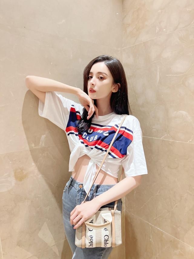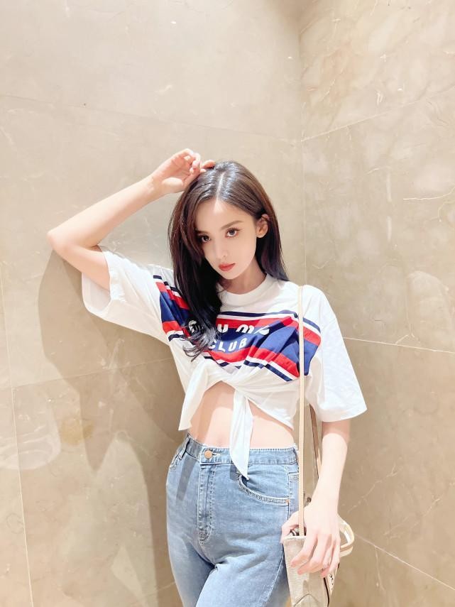 画面中的古力娜扎身穿白色的T恤,搭配修身的蓝色牛仔裤,脚踩着白色的运动鞋,一身造型也显得特别的休闲时尚,更加彰显出了她清纯可人的形象,她的肩膀上也挎着一个小巧而又精致的包包。