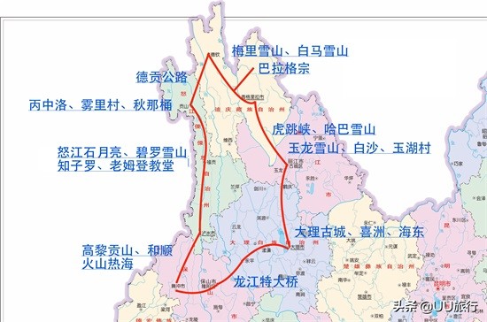 代表景点:大理古城、瑞丽热带雨林、火山地热公园、老姆登教堂、独龙江大峡谷、怒江大峡谷、虎跳峡、丙中洛、德贡公路、梅里雪山、普达措森林公园、玉龙雪山、丽江古城等。