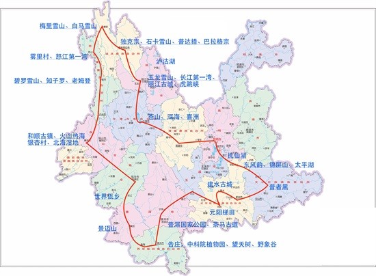 有大理、丽江、香格里拉;热带家园西双版纳;绿海明珠普洱;滇越铁路文化上的红河;文山普者黑、坝美;玉溪抚仙湖;还有怒江秘境,神秘独龙江;高黎贡山下康养胜地腾冲;世界佤乡临沧。