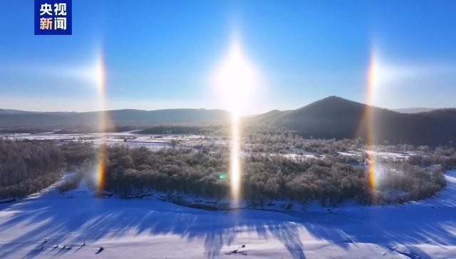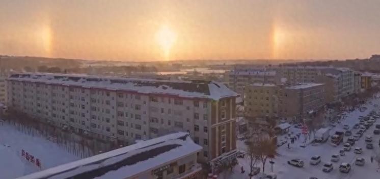 12月3日,黑龙江省逊克县上空出现双侧幻日景观。仰望天空,仿佛天空中出现了三个太阳。11月29日,内蒙古根河市也出现幻日景观,持续近五小时。