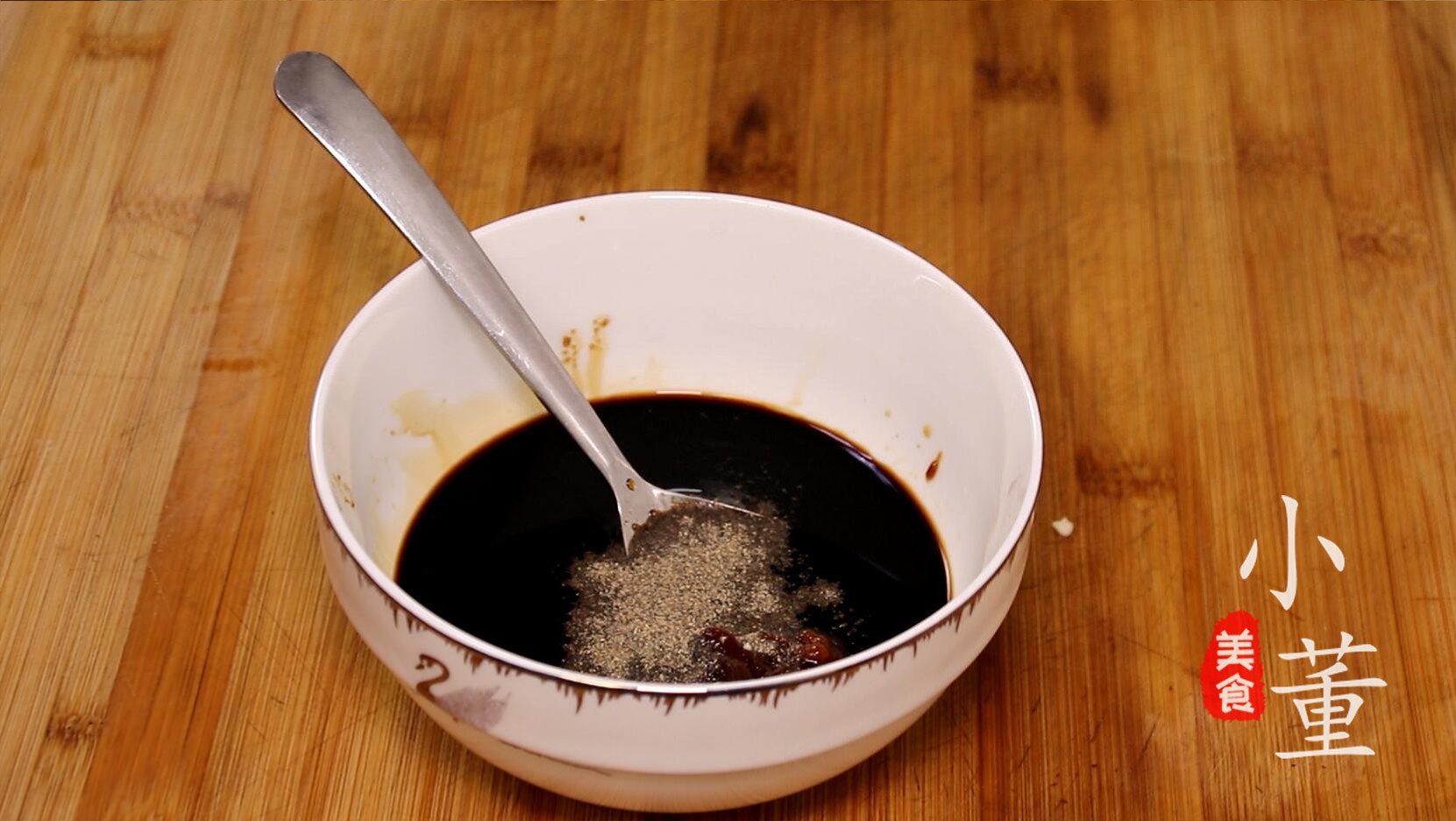 3、调料汁:下面调料汁,放两勺料酒,一勺生抽,一勺老抽,放一勺蚝油,一勺黄豆酱,一勺盐,一勺糖,少量鸡精,放点胡椒粉,搅拌均匀,加点清水搅拌均匀