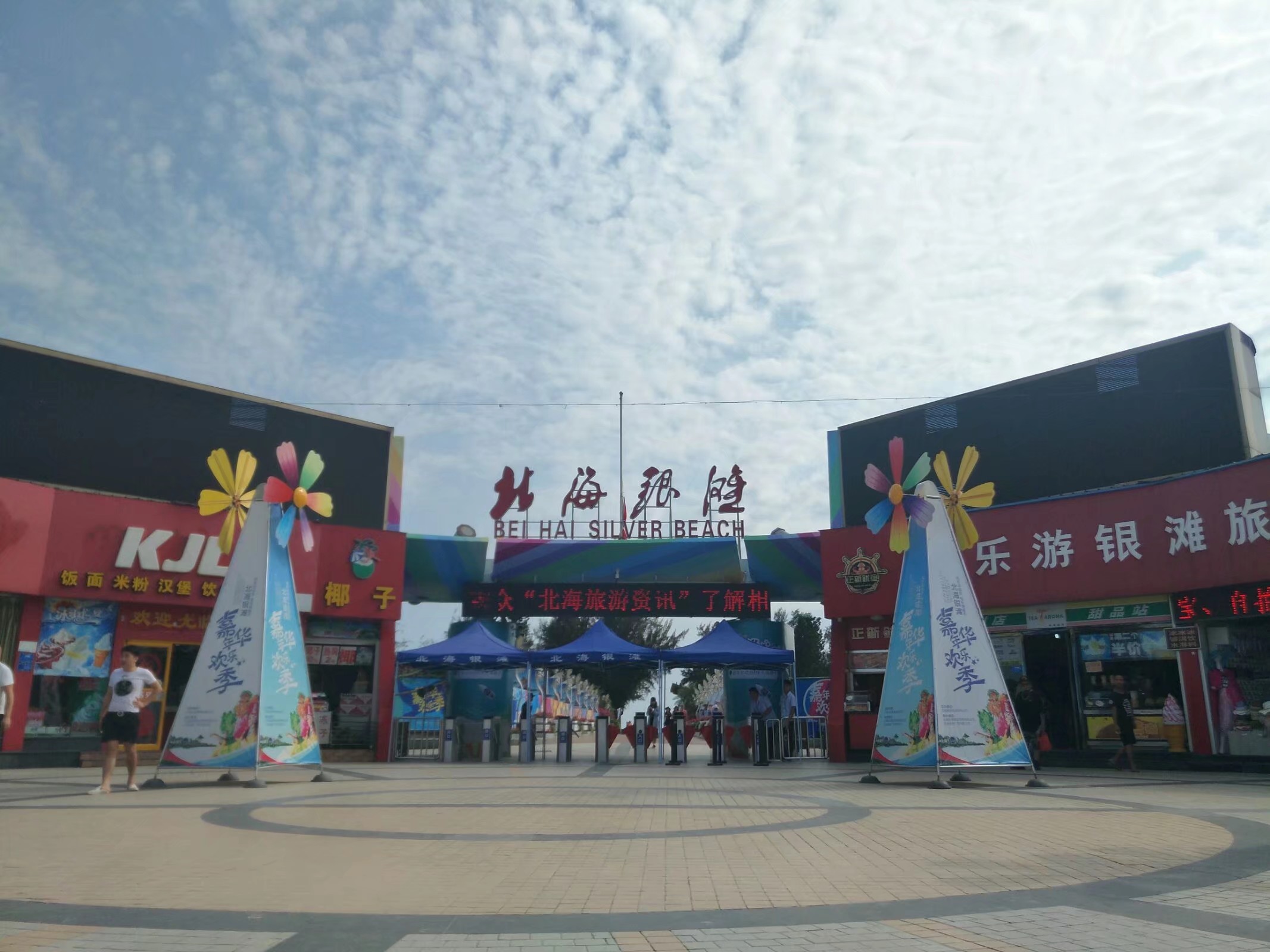 北海银滩位于广西北海市银海区,西起冠头岭,东至大冠沙,由西区、东区和海域沙滩区组成,东西绵延约24公里,海滩宽度在30--3000米之间,陆地面积12平方公里,总面积约38平方公里。北海银滩面积超过大连、烟台、青岛、厦门和北戴河海滨浴场沙滩的总和,而平均坡度仅为0.05。可容纳最大规模的沙滩运动娱乐项目和海上运动娱乐项目。沙滩均由高品位的石英砂堆积而成,在阳光的照射下,洁白、细腻的沙滩会泛出银光,故称银滩,北海银滩以其“滩长平、沙细白、水温净、浪柔软、无鲨鱼”等特点,而被称为“天下第一滩”。