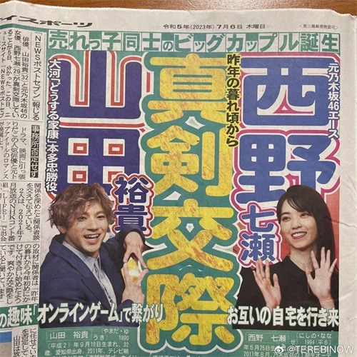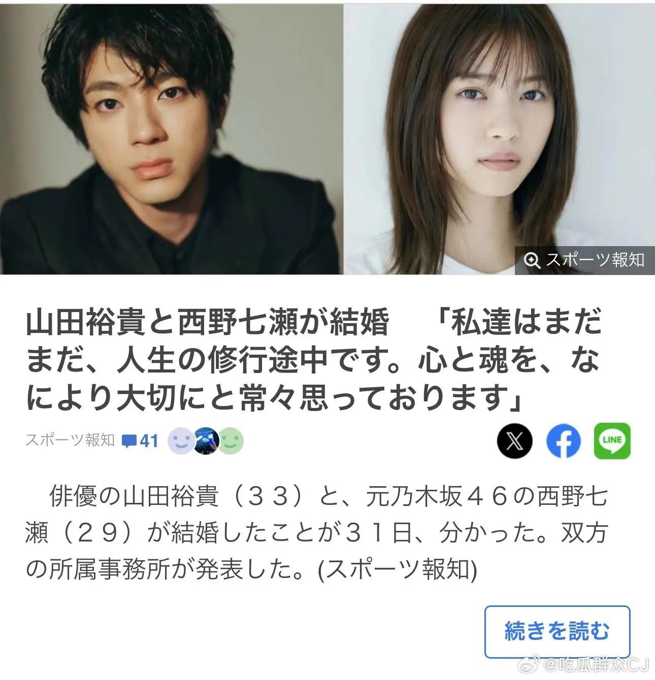 近日,西野七濑与知名演员山田裕贵宣布结婚。这对新人因共同出演电视剧而结缘,随后在合作中逐渐加深了彼此的了解和感情。两人在事业上都有着不俗的表现,此次结婚更是被誉为“金童玉女”的结合。