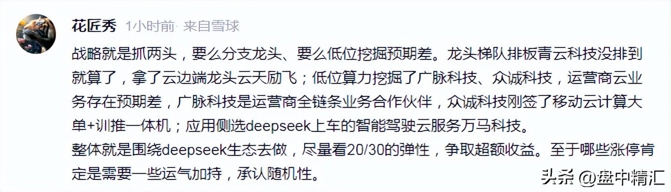 整体就是围绕deepseek生态去做,尽量看20/30的弹性,争取超额收益。至于哪些涨停肯定是需要一些运气加持,承认随机性。