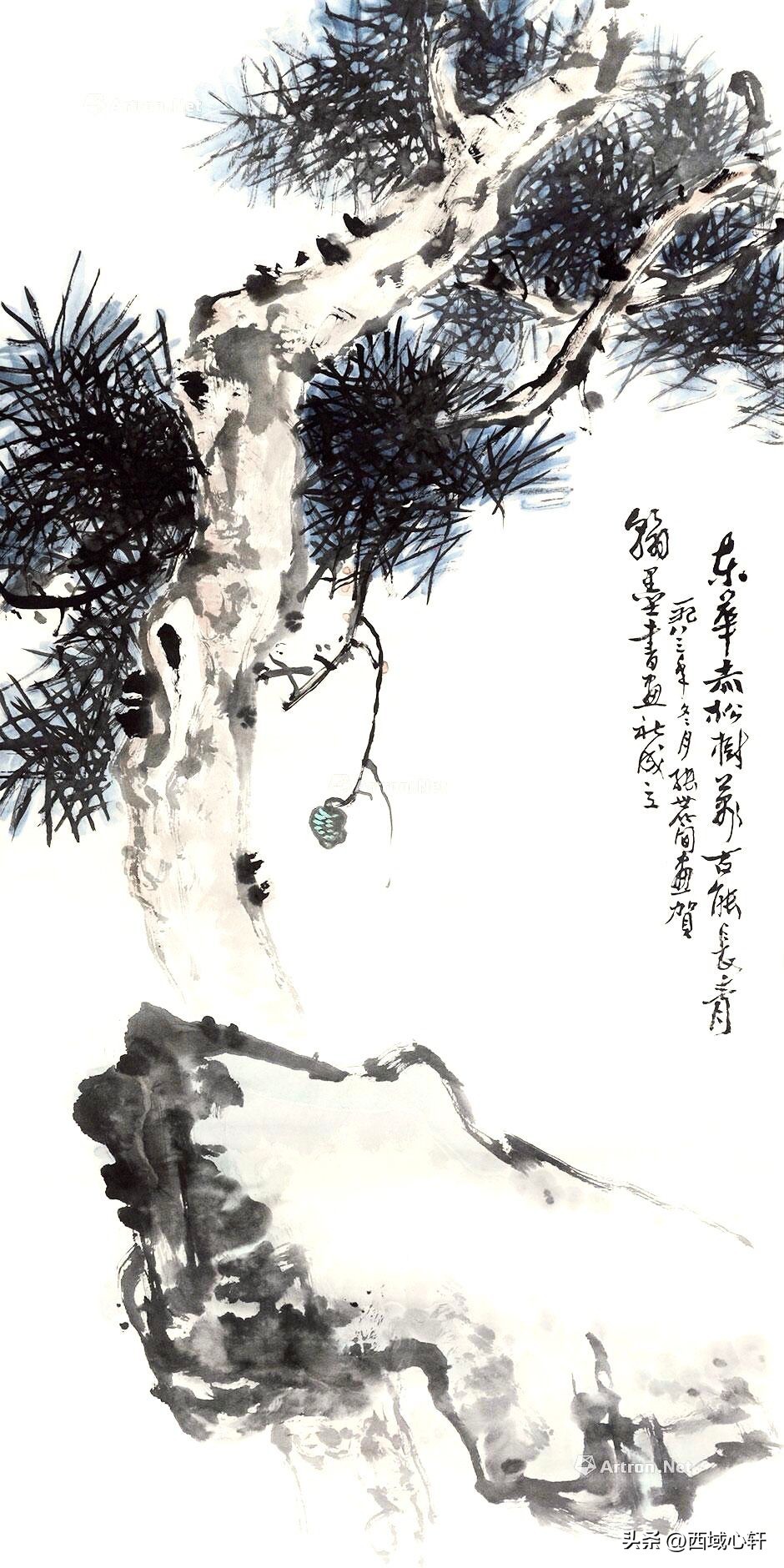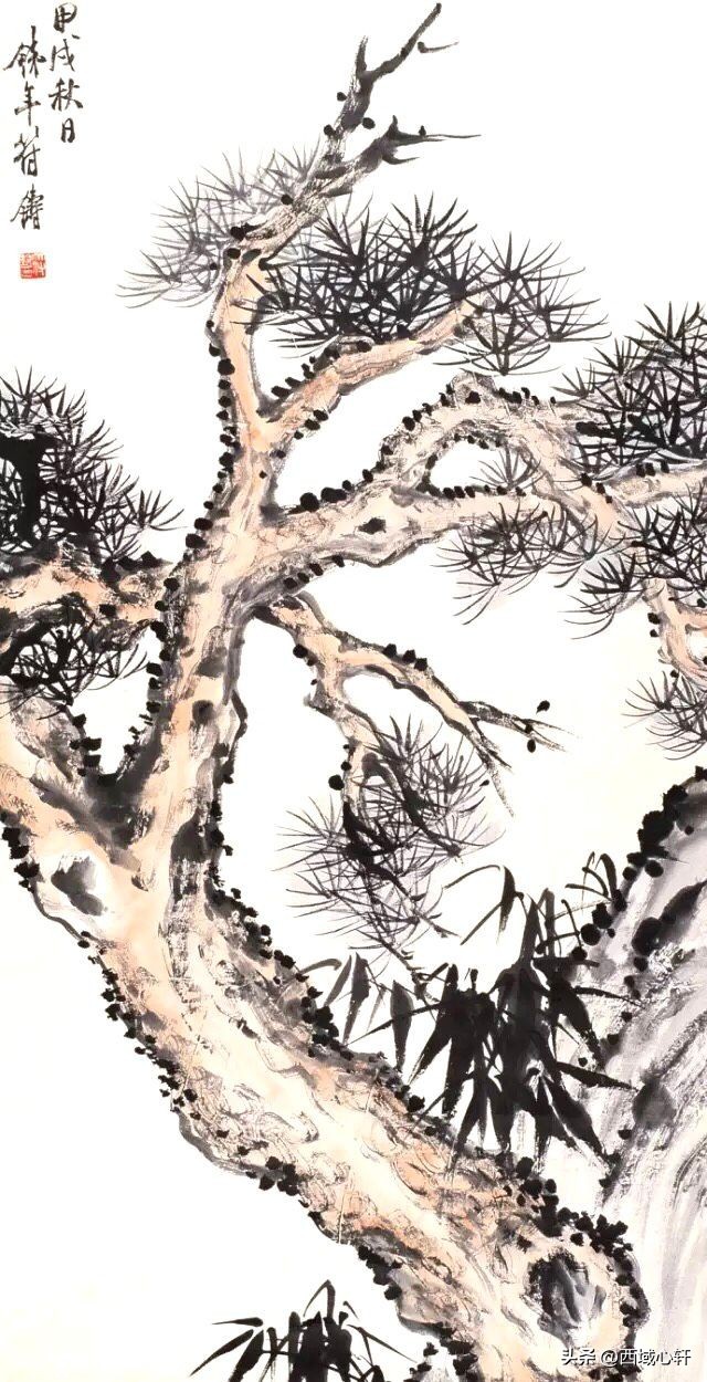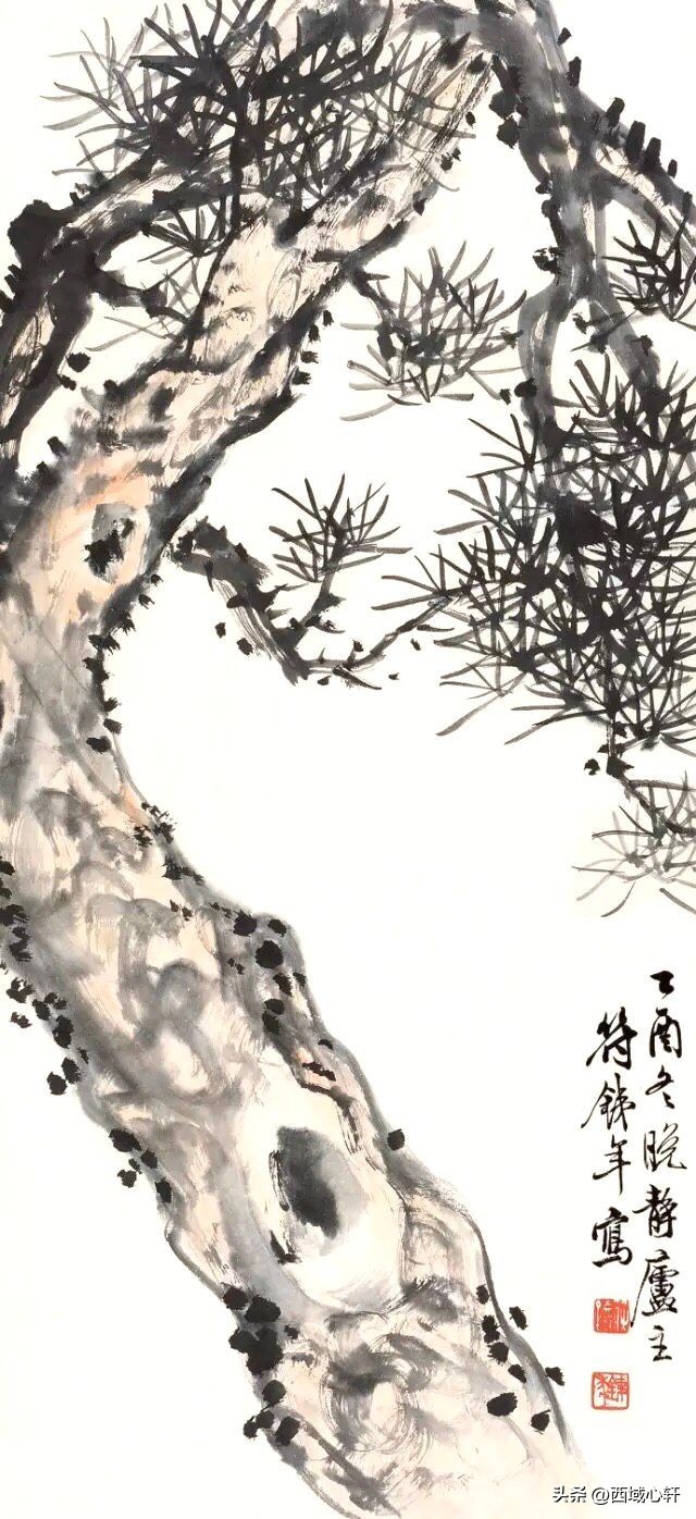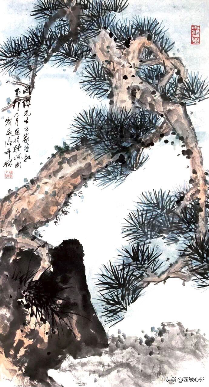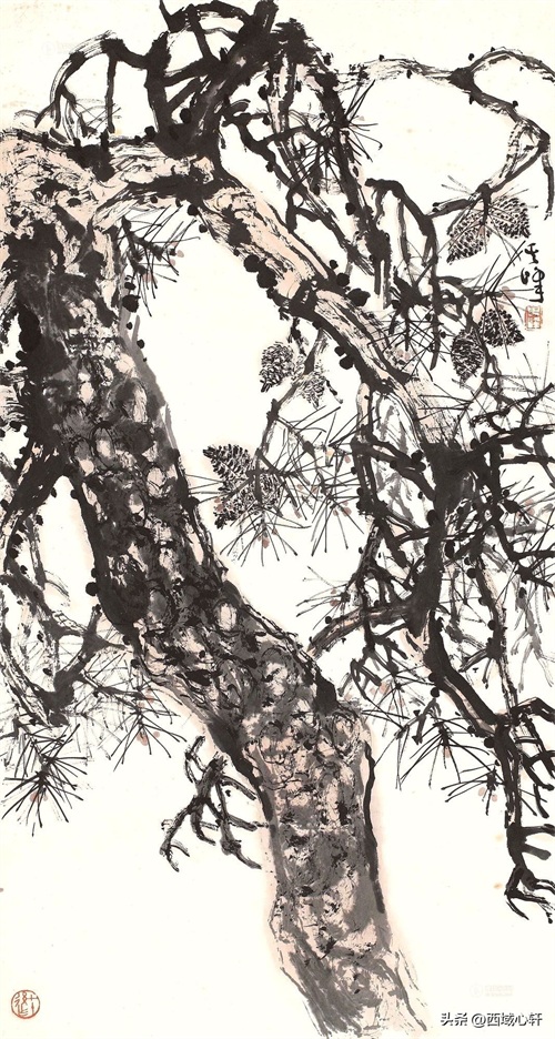 松树不仅是在内容形式上较为入画,他苍老的躯干,穿插枝杆、茂密的松针,都是十分入画的。毛笔在宣纸上皴擦点染、浓淡干湿,来表现松树的千姿百态。