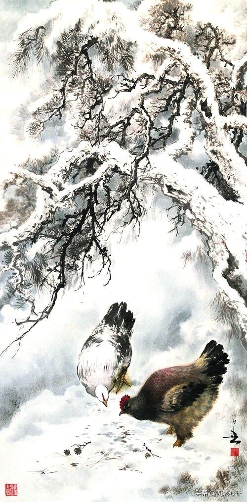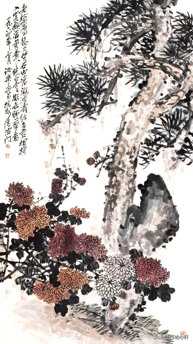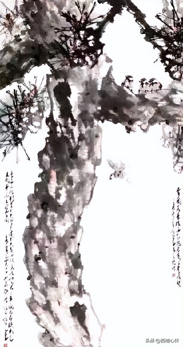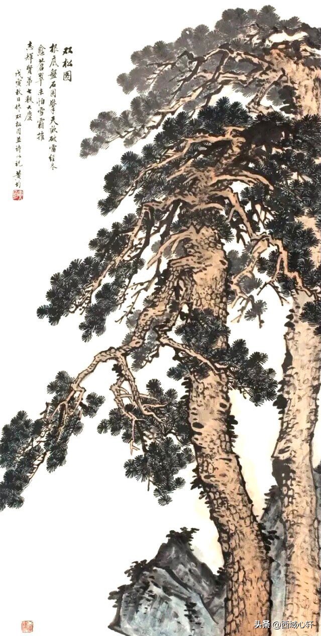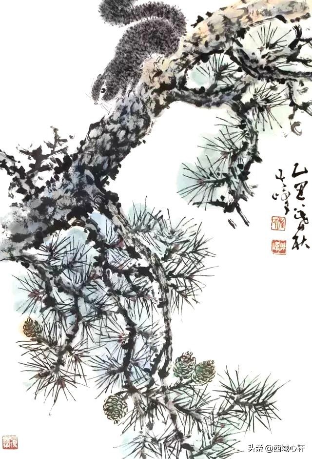 松树不仅是在内容形式上较为入画,他苍老的躯干,穿插枝杆、茂密的松针,都是十分入画的。毛笔在宣纸上皴擦点染、浓淡干湿,来表现松树的千姿百态。