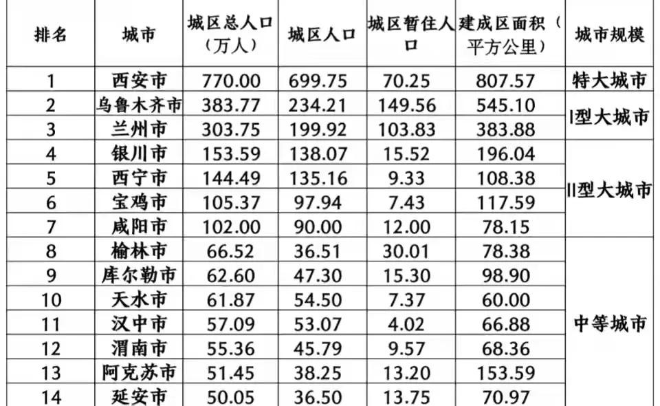 新疆自治区的首府城市乌鲁木齐和甘肃省会兰州市城区常住人口分别为383.77万人和303.75万人,根据划分,城区常住人口处于300万-500万之间的城市为I型大城市,乌鲁木齐和兰州城区常住人口达到了I型大城市的标准,因此成为西北地区第二、三大城市。