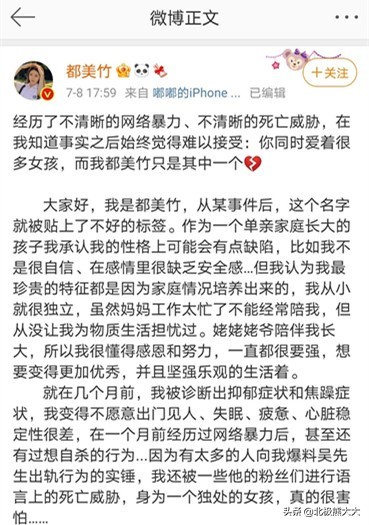7月8日,都美竹在微博上发声,称“自己经历了网络暴力和不清晰的死亡威胁”,并表示希望大家擦亮眼睛,不要被吴亦凡片骗了。