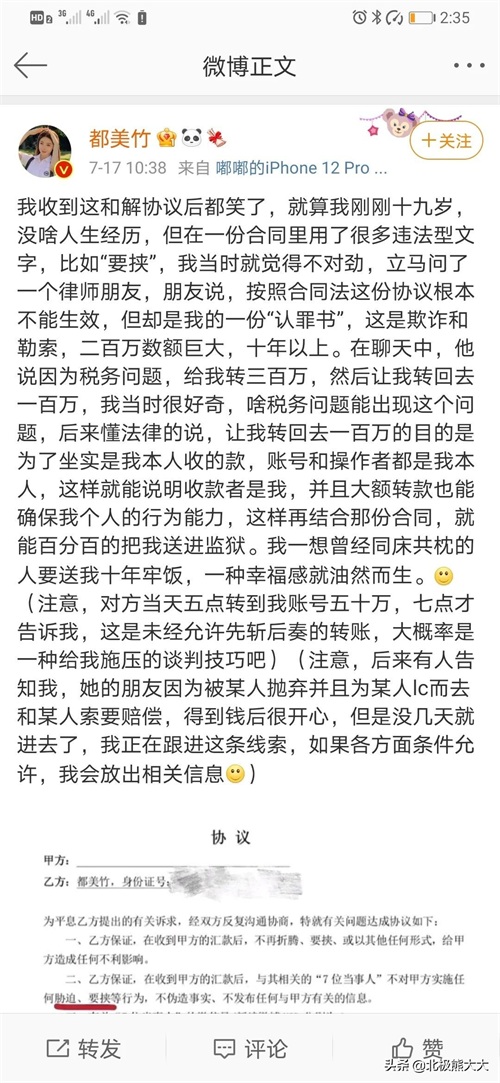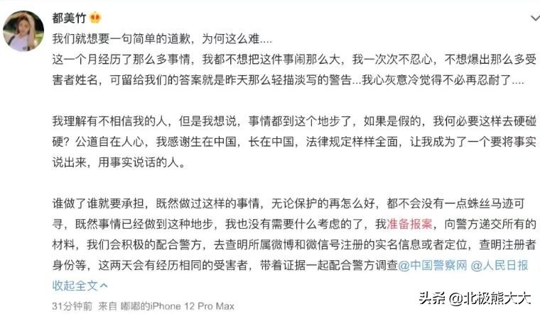 都美竹在文中表示准备报案,将会积极向警方提交所有材料,也会有其他受害者,带着证据一起配合警方调查。