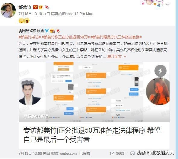 随着受害者人数越来越多,吴亦凡方套路又太深,都美竹当天就决定立马把钱给他打回去。