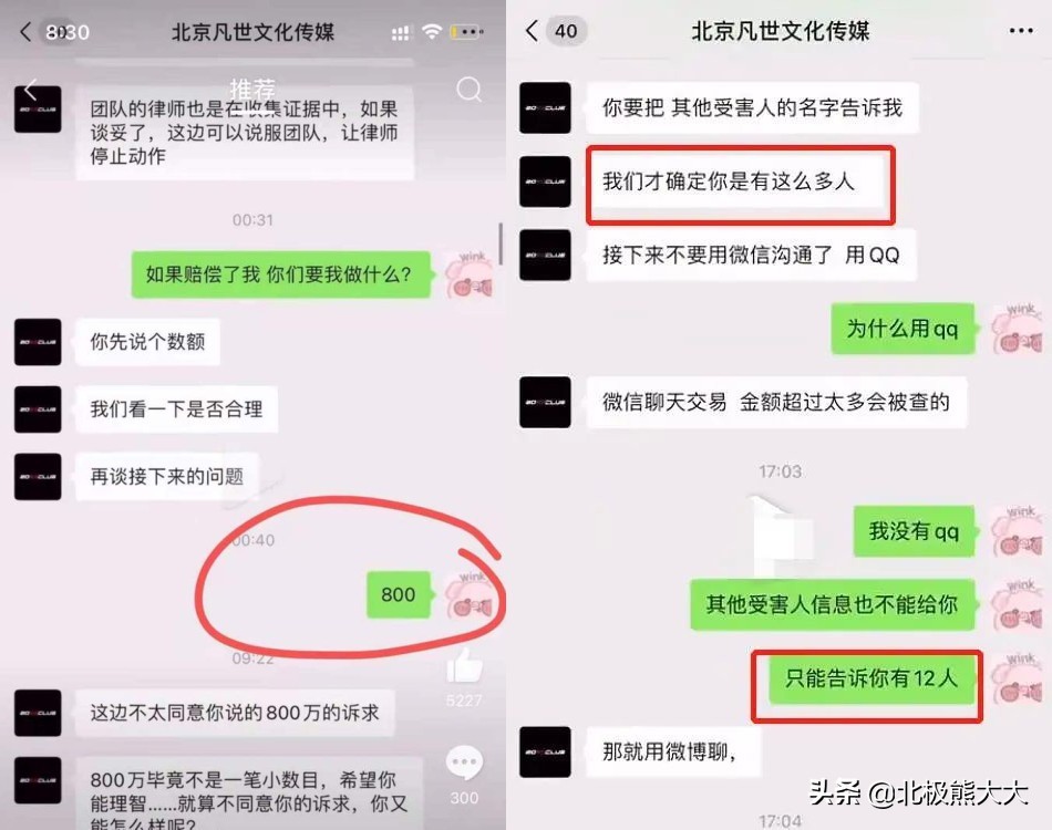 在聊天记录中,可以看到,受害人有12人,所以都美竹要800万,想给其他受害者多争取一些补偿。
