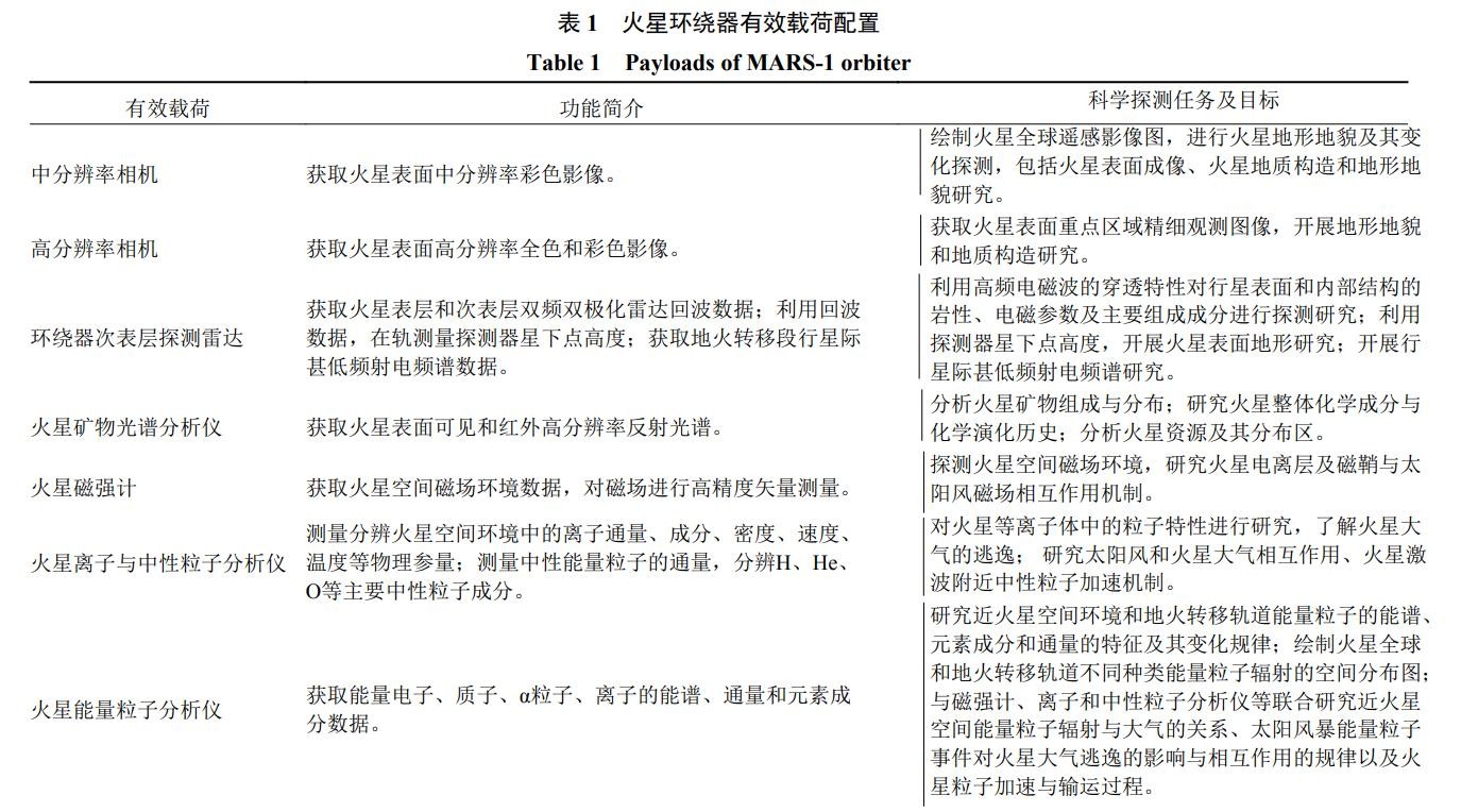 天问一号环绕器配置了中分辨率相机、高分辨率相机、环绕器次表层探测雷达、火星矿物光谱分析仪、火星磁强计、火星离子与中性粒子分析仪、火星能量粒子分析仪共7种有效载荷;