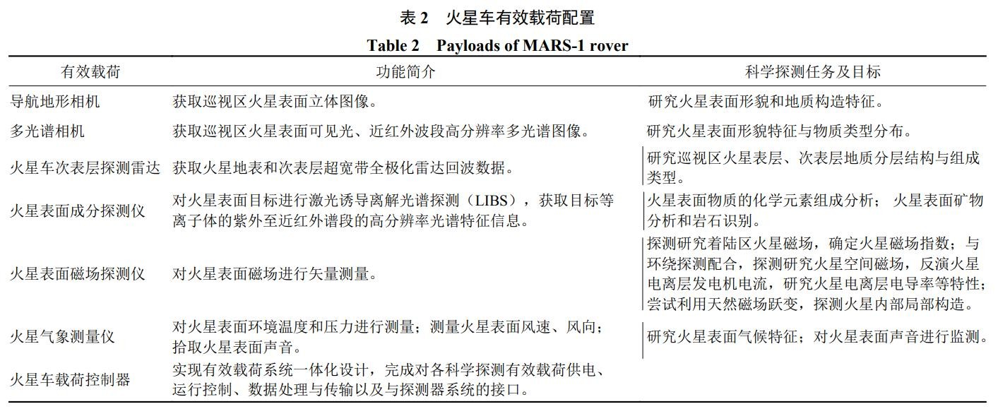天问一号火星车配置了火星表面成分探测仪、多光谱相机、地形相机、火星车次表层探测雷达、火星表面磁场探测仪、火星气象测量仪共6种有效载荷。