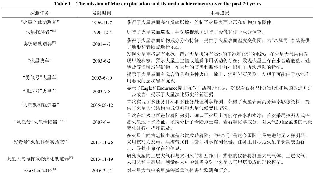 近20年来火星探测任务(表中除火星快车,ExoMars 2016外,其余均为美国)