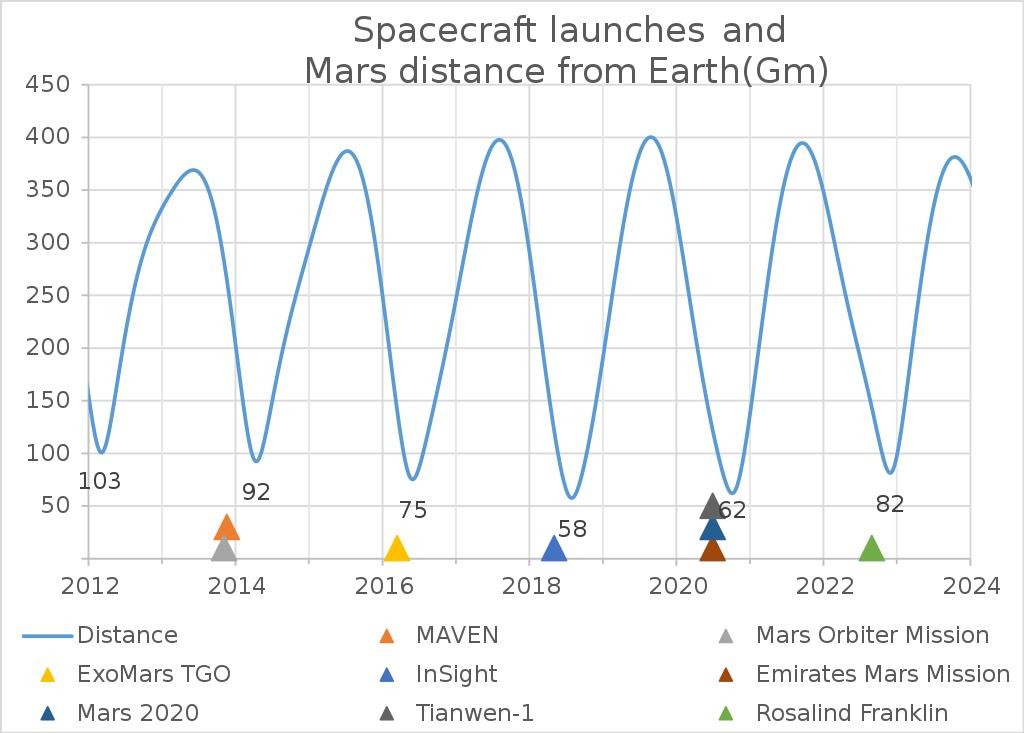 在进行霍曼转移前,必须考虑到飞行器的飞行轨迹与火星轨道有相交点,从这一点往前推,刨去飞船飞行所用的时间,就是飞船出发的时间,而这一小段时间就是所谓的发射窗口,而最近一次的发射窗口正是2020年的在7-8月份之间。