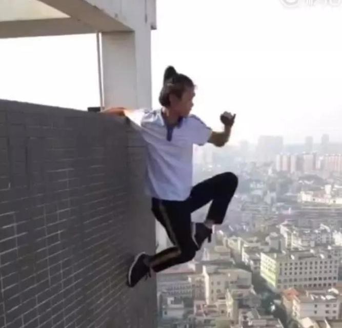 单臂吊在楼顶,还直言:“我不一定是玩得最狠那个,因为我每天都在爬,我是在玩命。”