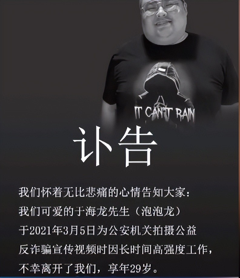直到2021年3月5日,突然看到泡泡龙去世的讣告,在拍摄反诈骗短片时,长时间高强度的工作导致泡泡龙离世。