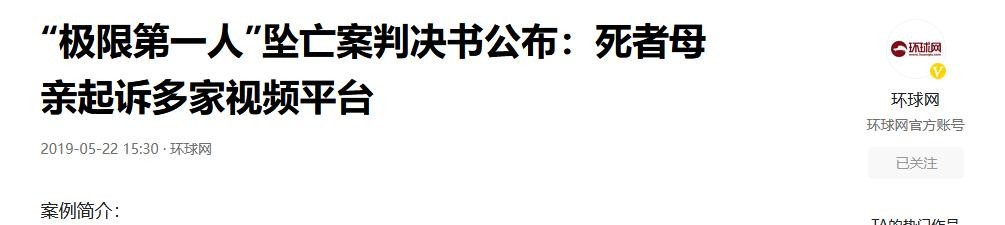 环球网2019.5.22关于“极限第一人”坠亡案判决书公布:死者母亲起诉多家视频平台的报道