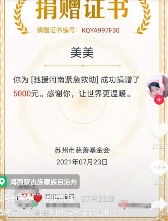 由于资金问题,美美十分省吃俭用,靠车上的太阳能和捡到的柴火牛粪烧火做饭, 却在河南暴雨期间为群众捐赠了共计1.7万块钱。