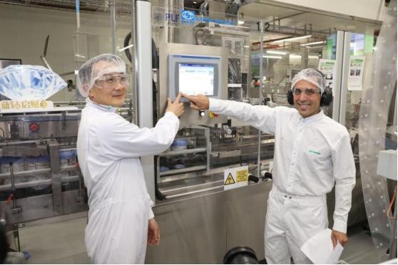 惠氏阿斯基顿工厂经理Antonio Prochilo与惠氏中国销售副总裁张展红共同启动蓝钻启赋生产线