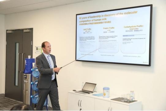 阿斯基顿研发中心汇集专业科研人员,坚持不懈地在婴幼儿营养领域进行深度探索。研发中心启赋研发负责人乔纳森里根博士为大家介绍了惠氏启赋品牌配备的科研力量,并着重揭示了蓝钻启赋所蕴含的“乳源活性因子”的营养奥秘。
