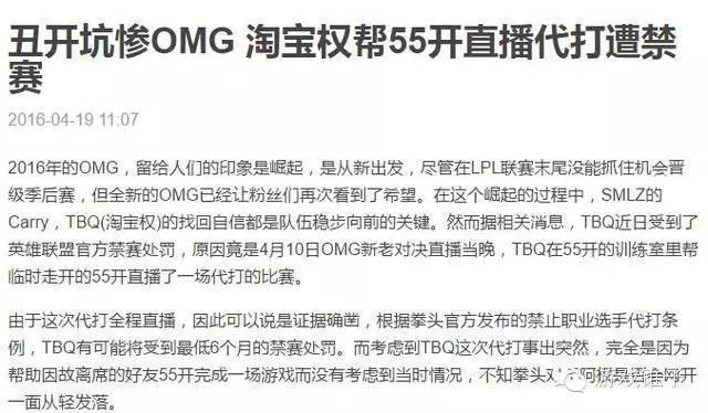 今天又是一波强势,据说淘宝权近日受到了英雄联盟官方禁赛处罚,原因竟是4月10日OMG新老对决直播当晚,淘宝权在55开的训练室里帮临时走开的55开直播了一场代打的比赛。