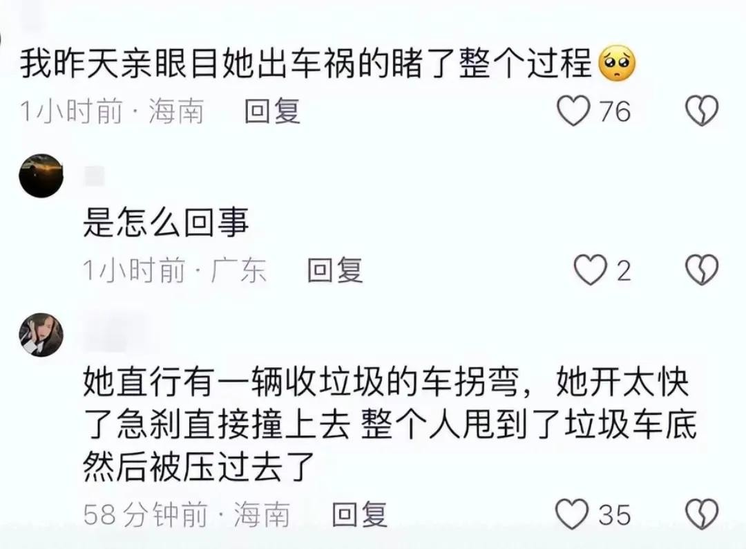 这次她出车祸,也是因为骑车的车速太快,碰到垃圾车没能反应过来才酿成的惨剧。